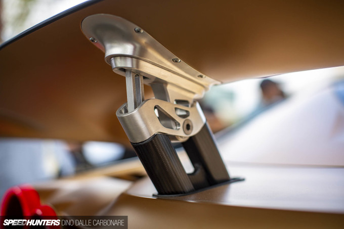 I had a chat to the Italdesign guys who were helping show off the car, and they were happy to give me a demo of how the spoiler retracts flush to the body and how it stands to position in a split second thanks to the actuators that control these beautiful carbon and billet aluminum stays.