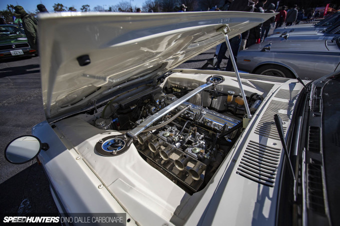 Under that black hood is the GT-R’s S20 straight six, here running some upgraded carburetors and aftermarket filters.