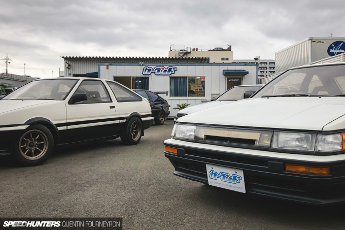 The first shop we stopped by in Kyoto was Carland86. This dealership is only 10 minutes from Kyoto Central Station and is really easy to access thanks to the Kintetsu-Kyoto line. Carland86 is owned by Tokuchi Masahito, and specialises in the restoration, modification, maintenance and reselling of AE86 Levins and Truenos. Carland86 is also famous for making exact replicas of the Fujiwara Tofu Shop car from Initial D. Fun fact: in the manga you can see the outline of a sunroof in the interior shots, but from the outside there is no sunroof. Carland86 reproduce this nuance by installing a roof liner for a sunroof model.