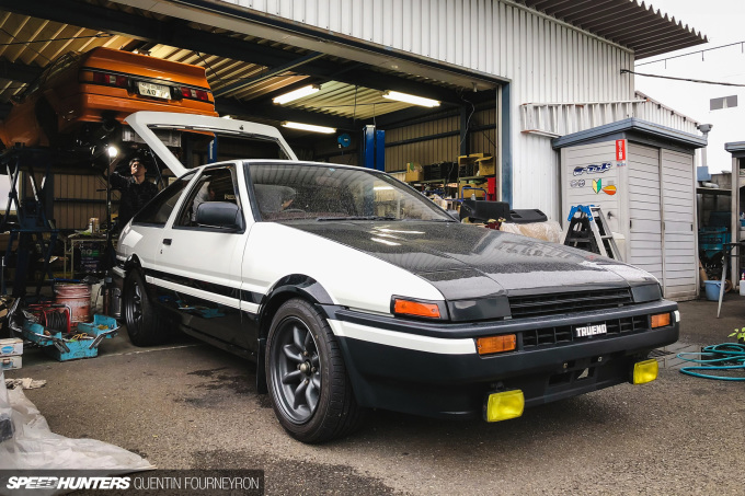 The first shop we stopped by in Kyoto was Carland86. This dealership is only 10 minutes from Kyoto Central Station and is really easy to access thanks to the Kintetsu-Kyoto line. Carland86 is owned by Tokuchi Masahito, and specialises in the restoration, modification, maintenance and reselling of AE86 Levins and Truenos. Carland86 is also famous for making exact replicas of the Fujiwara Tofu Shop car from Initial D. Fun fact: in the manga you can see the outline of a sunroof in the interior shots, but from the outside there is no sunroof. Carland86 reproduce this nuance by installing a roof liner for a sunroof model.