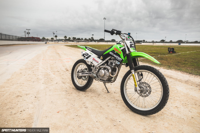 Of course, what I was really looking forward to was getting some seat time in on this little — especially in comparison to the prototype twins on display — Kawasaki KLX140.