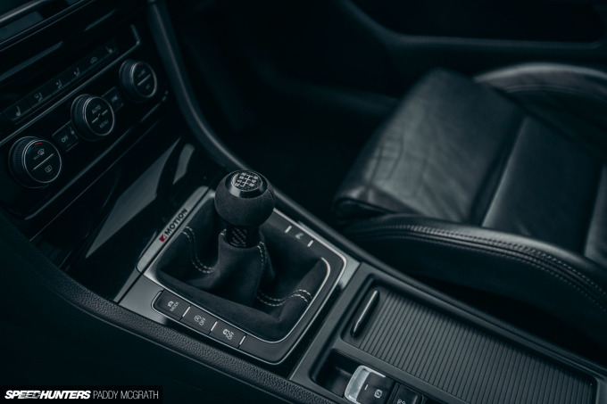 If there’s one area the Golf R falls down on from factory, it’s the seats. Donal has replaced his with a matching pair of leather VW/Audi Exclusive wingback Recaros, while also choosing to upgrade the rear shells to carbon fibre. The Alcantara-trimmed OE steering wheel matches the custom shift gaiter.