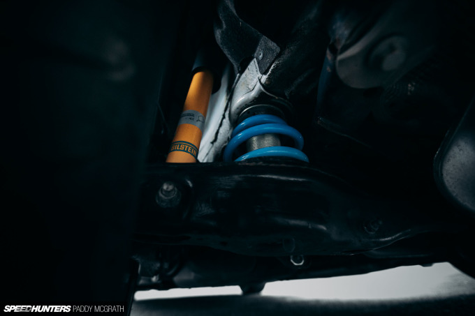 The car is sprung on BILSTEIN B14 adjustable front coilovers with matching adjustable rear dampers and springs housed within the multi-link setup.