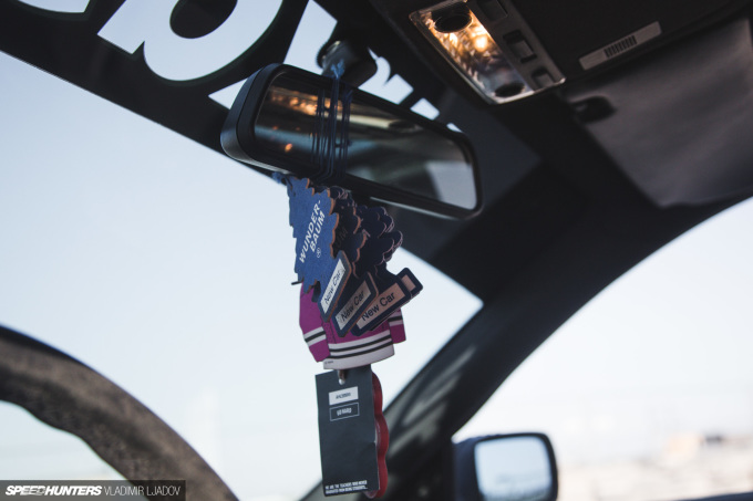 The interior is full of custom touches, from the billet shifter, to a hilarious number of air fresheners, to stickers, to the one-off horn button on a QSP sports wheel. Interestingly though, all the details still complement the Alcantara trim.