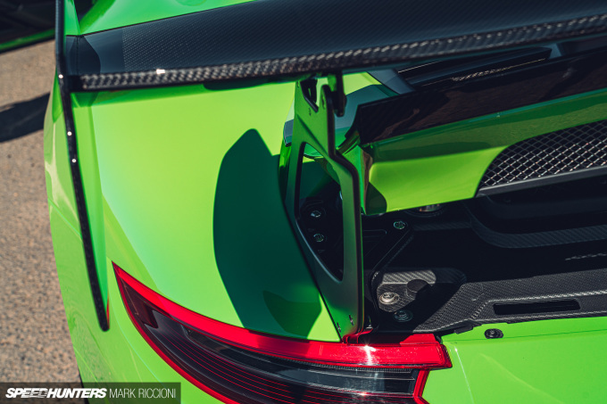 The depth of detail in this development regime is staggering. The enlarged rear wing is not just a replacement wing element – that is only the tip of the iceberg. If you look deeper, the wing uprights are no longer supported by the deck lid but mounted directly to the chassis. In turn, the deck lid is shortened and opens between the wing uprights, rather than opening with them like on the normal GT3 RS. Under the deck lid, new carbon fibre panels make the installation look completely OEM. If you’ve never seen a stock GT3 RS you’d be very hard pushed to tell how the MR is different.