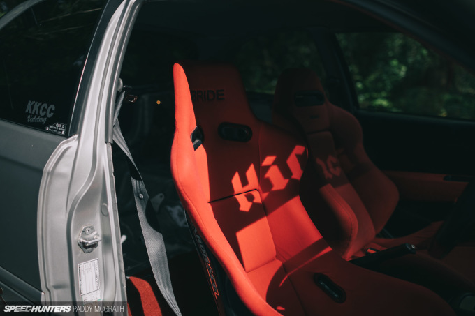 The interior is a bit Jekyll and Hyde; from the B-pillar forward it’s almost factory, but behind the posts it’s as spartan as can be. A Bride fixed-back with the stock Recaro reclining passenger seat is a great combination.