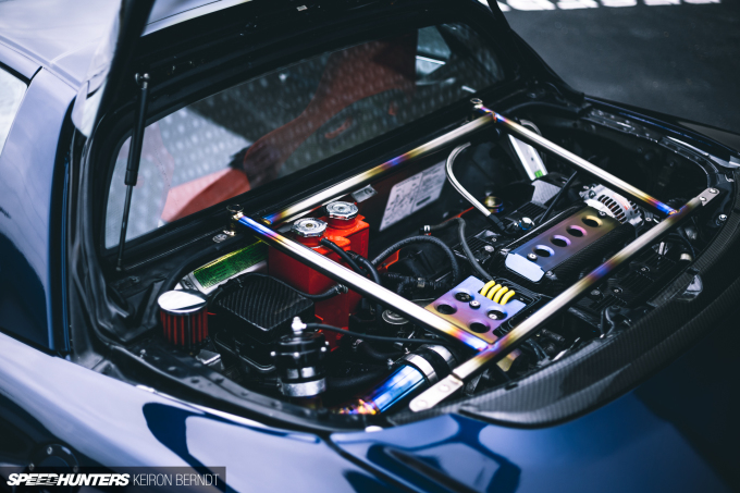 The vibrant tones of heated titanium appear throughout thanks to Chasing J’s who supplied their intake manifold plate, throttle body cover, oil cap, and hood prop. Carbon fiber adornments under hood were provided by NC Auto USA.