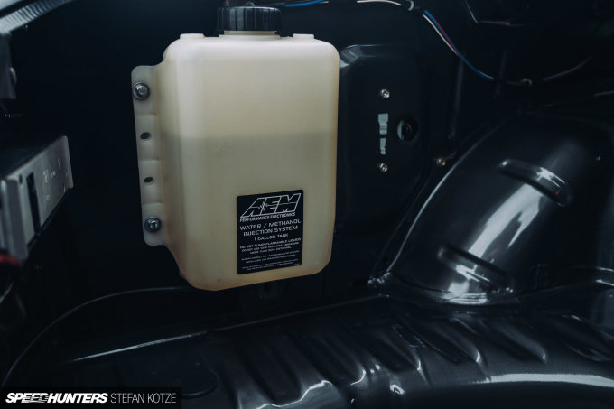 Other modifications include a Koyorad aluminium radiator with twin Spal 12-inch fans, an AEM water/methanol injection kit (with tank in boot alongside a race battery), and a Link G4 engine management system to control everything.