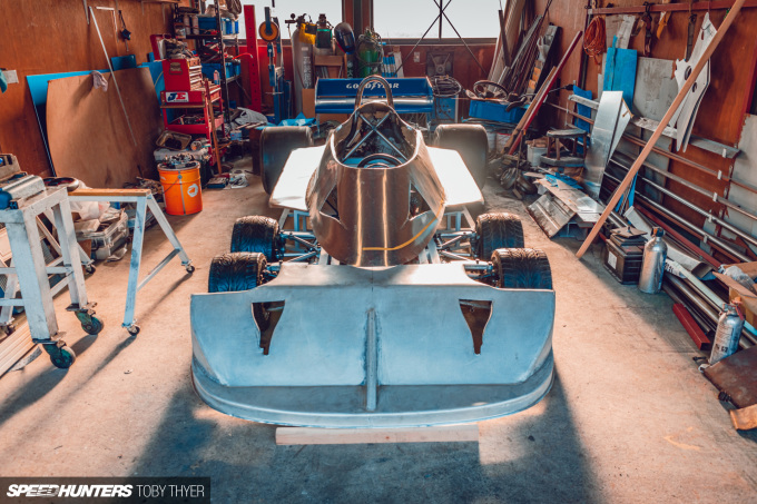 Swiftly moving on – because that’s not the half of it – in the next garage sat something quite strange, even for Japan. This is a hand-built Tyrell six-wheeler weighing 350kg (anticipated) with a 1,300cc Suzuki Hayabusa bike engine in the back. Sound terrifying? Don’t worry, it won’t be competitively raced.