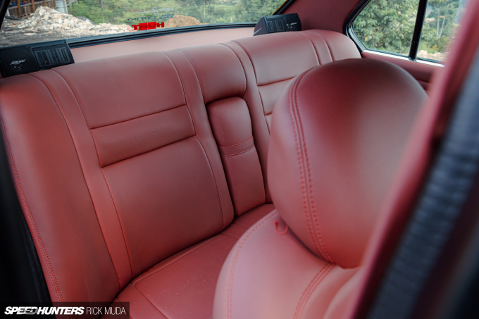 Inside the car, the BBS name shows itself again. At first I thought Hakim was just playing homage to the wheel brand, but as it turns out, BBS seats were actually a thing. In this case the electrically-controlled and heated recliners have been re-trimmed in a rustic red by Cabin Car Leather, and the theme keeps going with custom BBS-branded door cards and mats.
