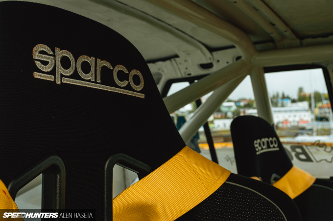 Inside, the Corolla is all race car with a custom-welded roll cage that ties in front and rear suspension towers, Sparco seats with Racequip 6-point harnesses and custom shifter and handbrake levers that Grétar made himself. In fact, most of the work on this car is all his own.