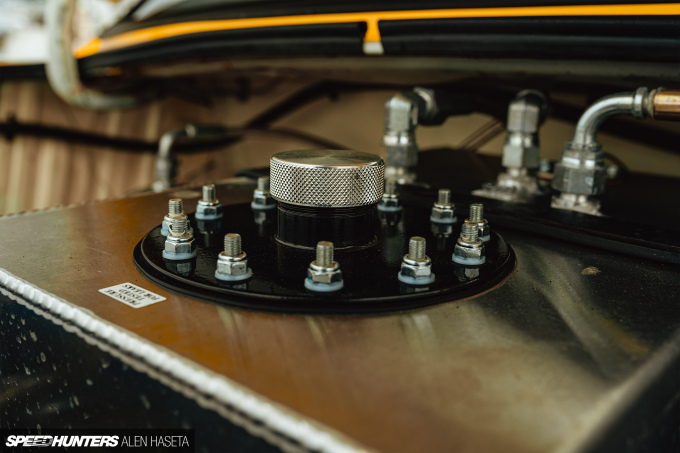 As you can see, the 2JZ is not stock. The original twin turbochargers have been traded for a big single Boost Lab BorgWarner S366SX, and inside the engine now reside CP forged pistons and Manley forged connecting rods. The trunk-mounted fuel system, running twin AEM pumps, a custom surge tank and Aeromotive filters, supplies the engine via 1,000cc Bosch injectors, with the whole shebang controlled by a VEMS engine management system. For cooling, there’s a rear-mounted radiator with a dual fan setup.