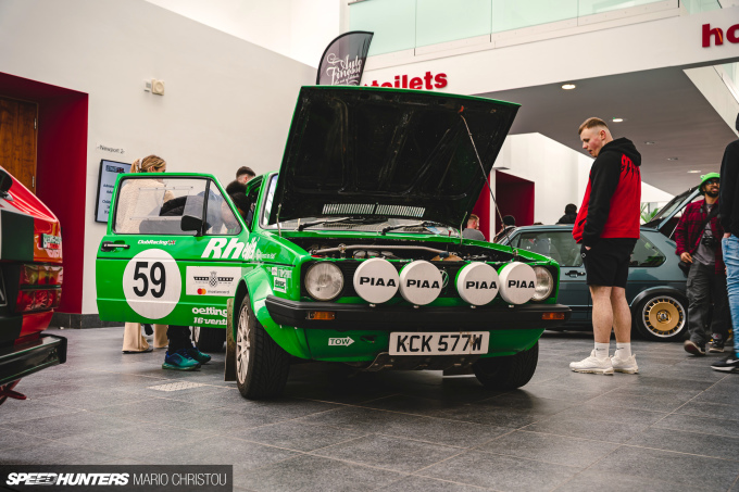 This thoroughbred looks as though it’s in parc fermé, hot off an RAC historic rally stage. Nothing is clean, and nothing appears perfect. In fact, there’s probably as much weight in dirt and debris on this Golf as there is in carbon fibre on the other!