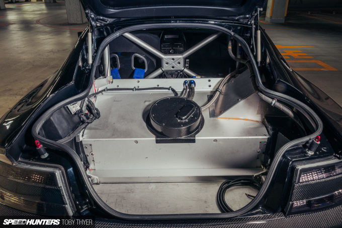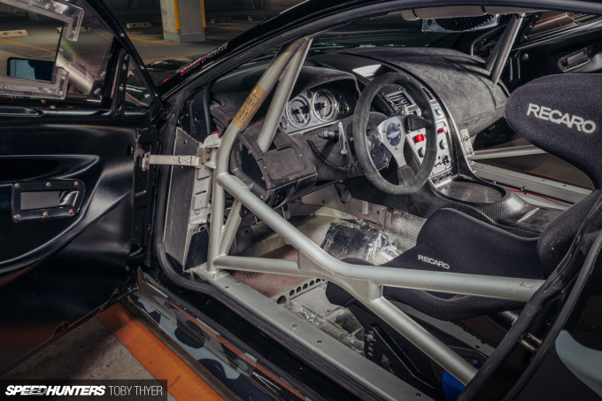 There’s no plush carpeting or cup holders in here – it’s as bare as any purpose-built race car out there. After about the fifth time asking “is that factory?” and Hiro-san’s reply being “yes”, I focused on trying to get the best photos I could in such a tight space. The most obvious factory piece is the integrated FIA-approved aluminium roll cage, which joins directly to the lightweight bonded aluminium chassis.
