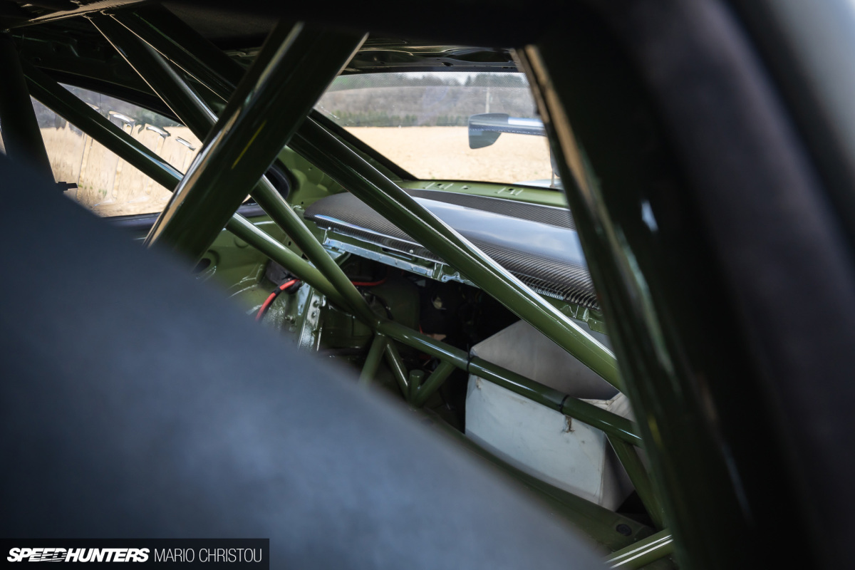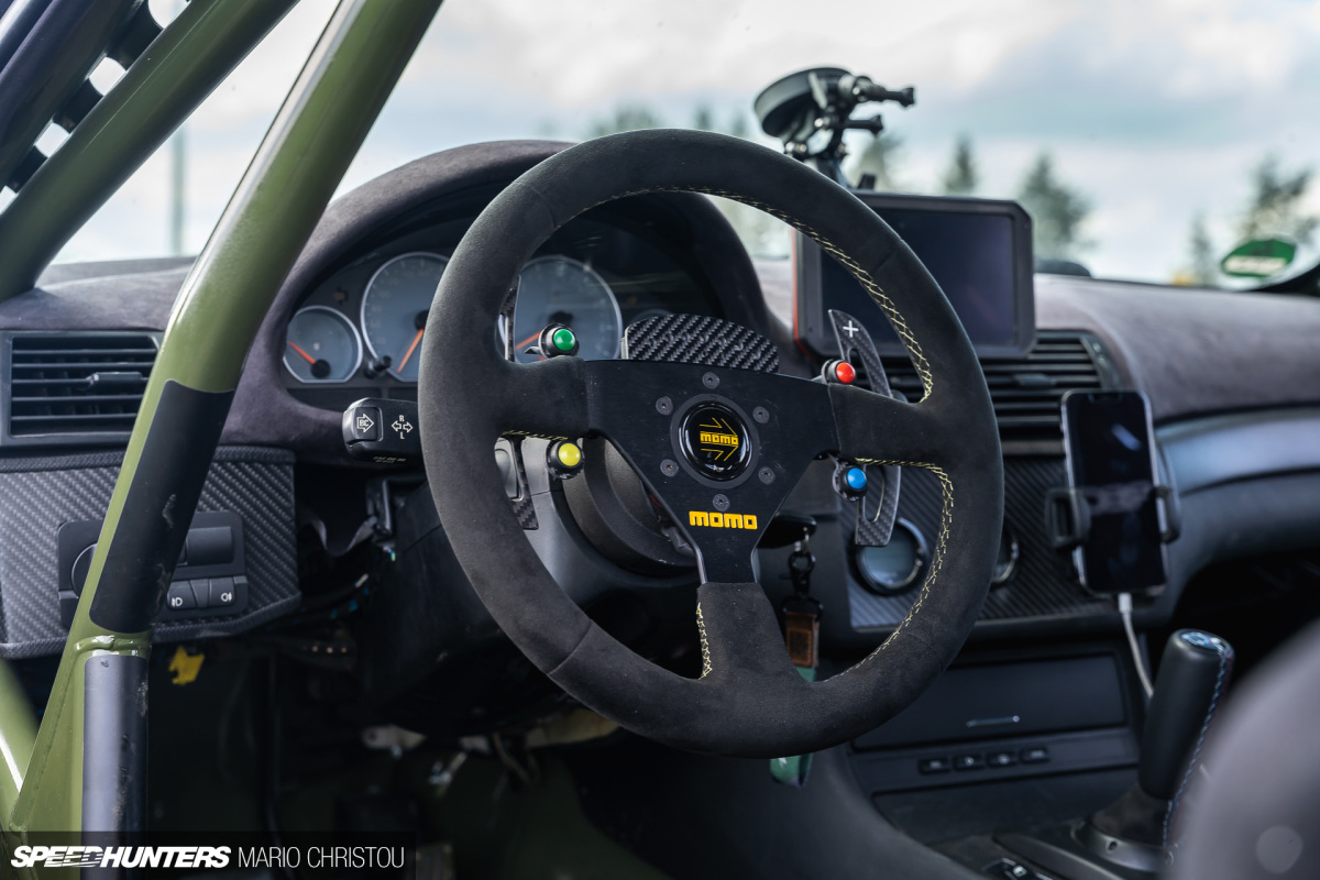 The most notable change is the colour, obviously. The M3 was resprayed in entirety as a bare shell in a BMW Individual shade called Urban Green. Fabian’s initial idea was to keep the car the original colour, but his father-in-law has a bodyshop and would simply not allow it. There is no silver grey left on the car. Even the roll cage is the body colour.