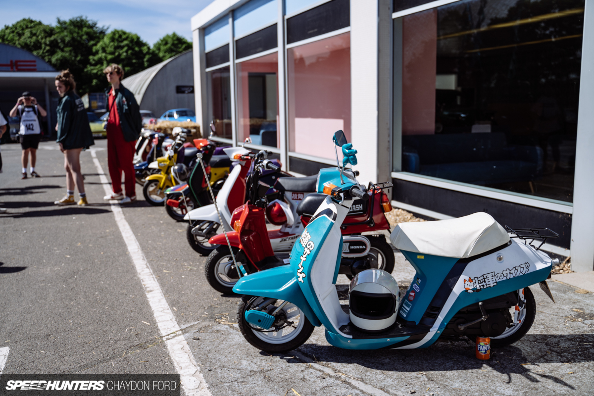 One of the more unique groups at the Weekender were the Gentsuki Gentlemans Club. Gentsuki (the Japanese for scooter) have always been the most cost-effective way for younger individuals to commute in the often-crowded streets, and given the Japanese penchant for modifying bikes and cars, it was only natural for scooters to receive the same treatment. The scooters often mimic bosozoku styling: loud, low, bodywork modifications and graphics that pay homage to race liveries.