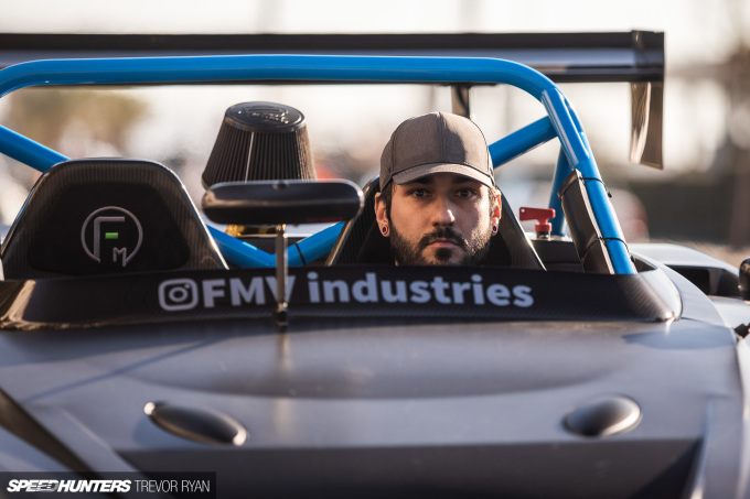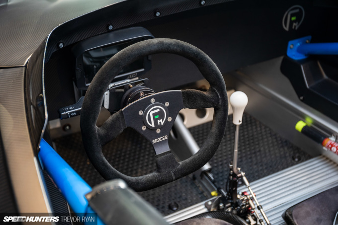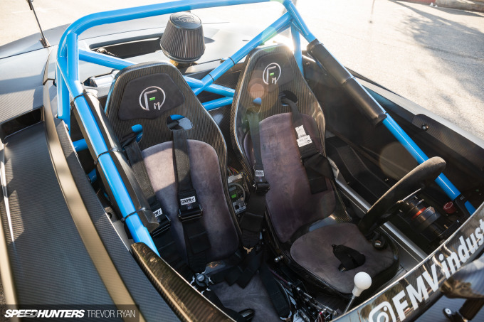 The cockpit is updated with Technocraft T3 carbon fiber bucket seats mounted to stock sliders, and Areg’s FMV Industries logo has been embroidered onto the headrest pads. You’ll also notice this emblem added to the Sparco steering wheel.