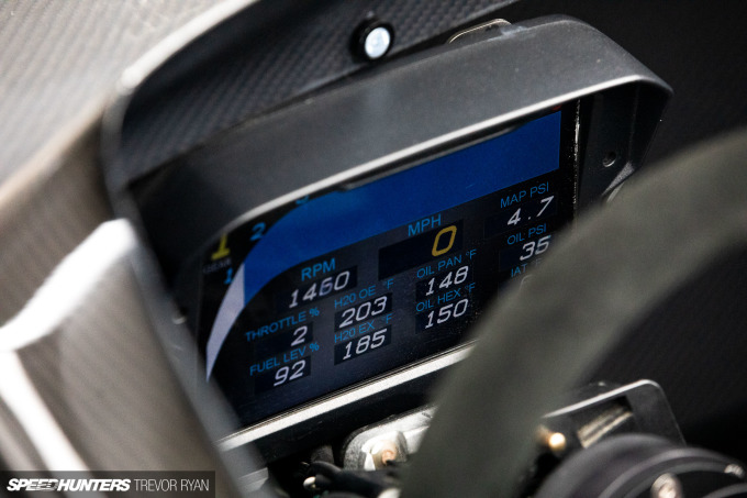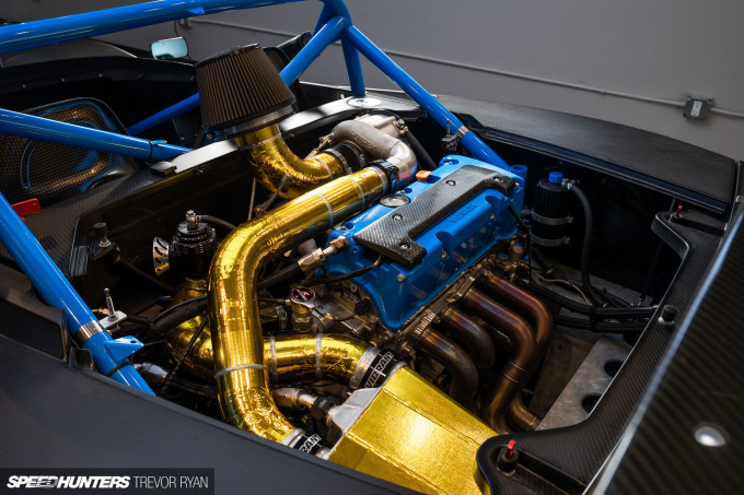 Gone is the Toyota powerplant, and in its place sits a K24A2 sourced from a 2005 Acura TSX. The Rotrex-supercharged and Garrett water-to-air-intercooled engine has been treated to tunes for US 91 octane and E85, which produce 440hp/325lb-ft and 570hp/392lb-ft respectively. The Honda PRC/RSX ECU is running Hondata K-Pro management, while other updated hardware includes a Hybrid Racing fuel rail, Grams 1,150cc injectors, K20 water and oil pumps, an FMV industries stainless steel exhaust header, and a Burns two-stage muffler.