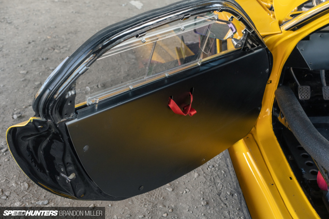 The interior is all business, with just the essentials. There’s a custom 10-point roll cage by 945Garage, an aluminum race dash plus door and heel plates by Bubble Tech, a quick-releasable Sparco steering wheel, Bride seats, TAKATA Racing harnesses, Racebred Components shift knob and a super-light Antigravity battery.