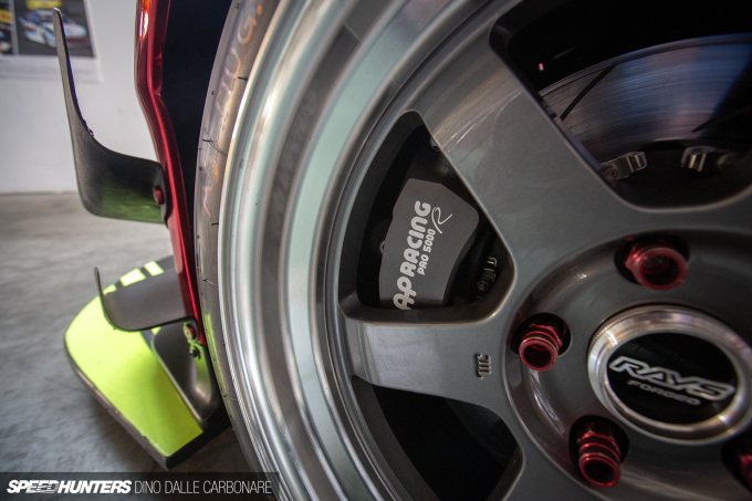 For balance, Alan went with a staggered wheel setup. The RAYS Volk Racing TE37Vs measure 17×9-inch up front and 18×10-inch at the rear, all shod in racing slicks.