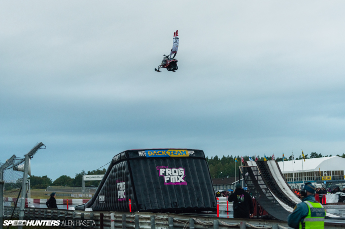 While the crowd didn’t seem bothered by it, there was concern for the safety of those about to launch themselves off the ramp and onto the landing pad. Both were set up on the Mantorp dragstrip, which turns into an ice skating rink when wet.