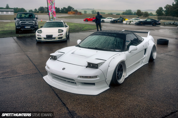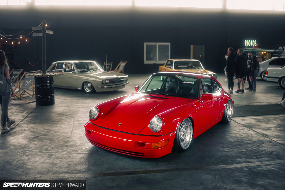 To my left and right were numerous stance cars parked in front of the airfield hangars. And the engine noise? That came from a Porsche 911 by German tuner 9FF while it made another high-speed pass down the makeshift runway drag strip.