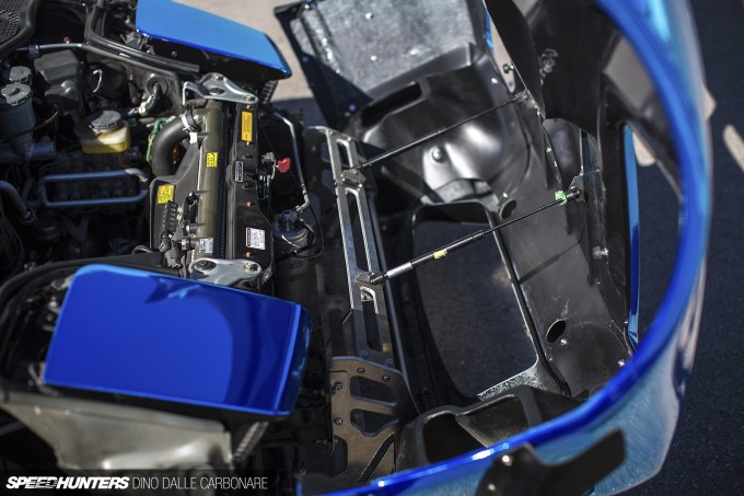A small frame was then constructed and bolted onto the front end of the chassis, from which the big single-piece FRP cowl is hinged and supported from. Those gas struts help make the whole opening and closing procedure easy, and for something aftermarket it all works pretty effortlessly.