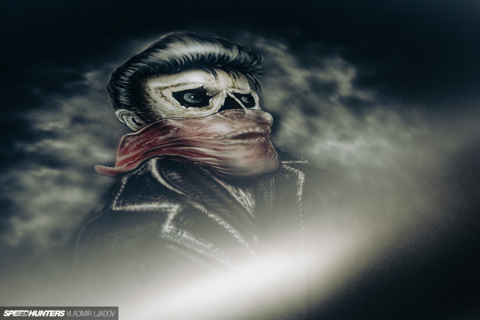 The custom paint job is where the Rockabilly Freakout truly shines. Finished in a rich mocca black with ghostly red flames and airbrushed skull-head holograms, the car looks like it emerged from a twisted dreamscape. Inside the doors and on the firewall, the Rockabilly Freakout story is written in detail, a nod to the creative narrative that inspired the build.