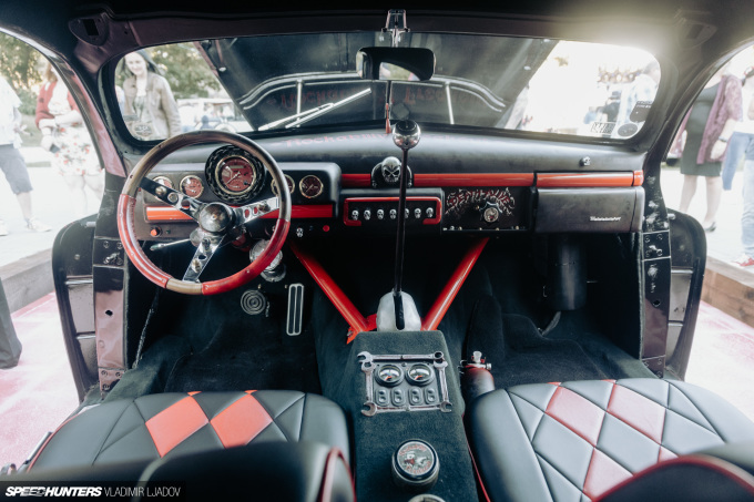 The interior is handcrafted, with a completely restyled original dashboard featuring functional skull knobs. The front seats are from a 1960s Nash, all black leather with striking red diamonds.