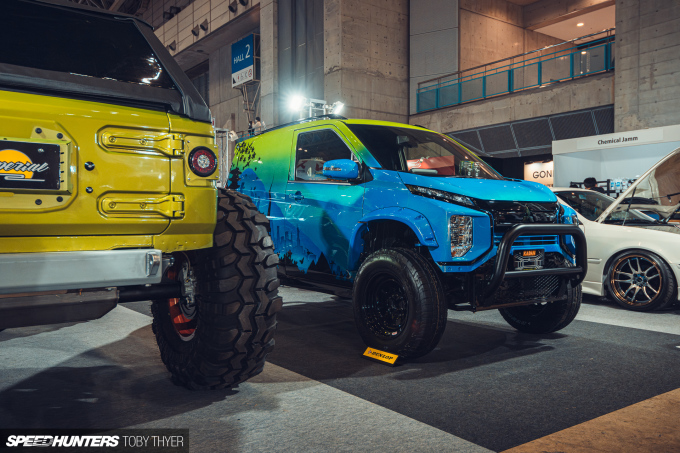 The first is a Mitsubishi EK Cross EV. While it’s still just a front-wheel-drive electric kei car, the high lift and the artwork depicting the Osaka Castle alongside the Tokyo Skytree more than offset any powertrain deficiencies.