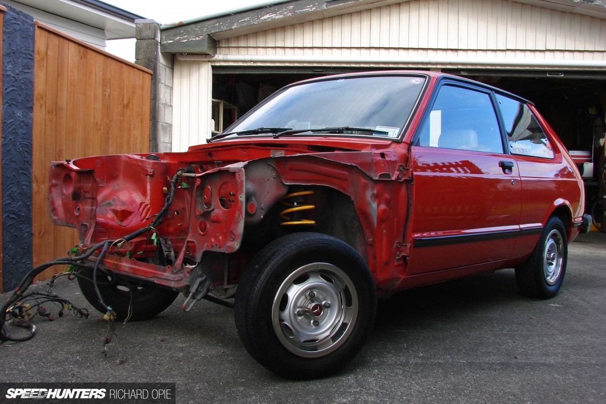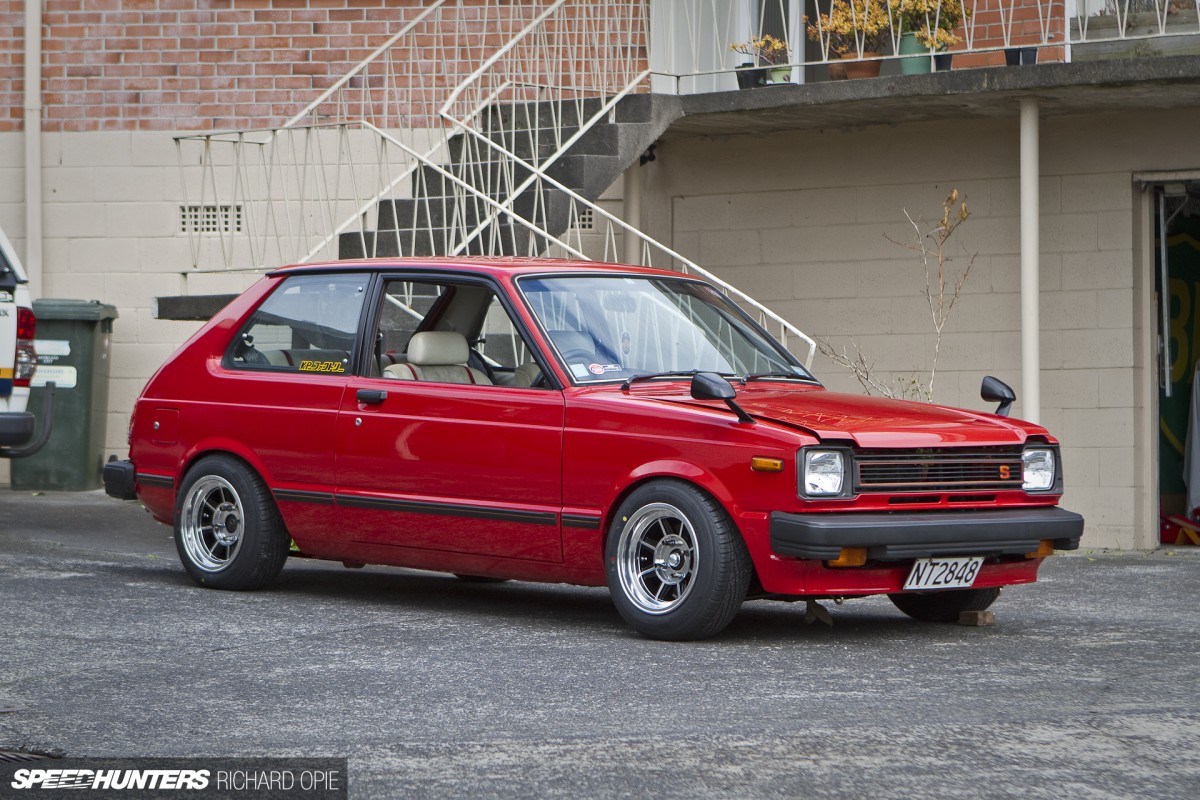 I’m not sure I achieved a whole lot that day, Linguistics 201 definitely went in one ear and out the other. All I could focus on was making it to 5:00pm and picking up my new Starlet. Suffice to say, eyeballing the small crowd that was also present to view the car didn’t really make my day. But I’m born of proud negotiating stock, so I put on my bravest face and swaggered through the assembled throng to be confronted by a slightly beaten up, but otherwise original 1981 KP61 Starlet 3-door. In fact, it was more than that, this was a Japanese market model blessed with a higher spec than New Zealand new cars, namely a 4K-U 1,300cc powerhouse and a K40 4-speed gearbox. Perfect.