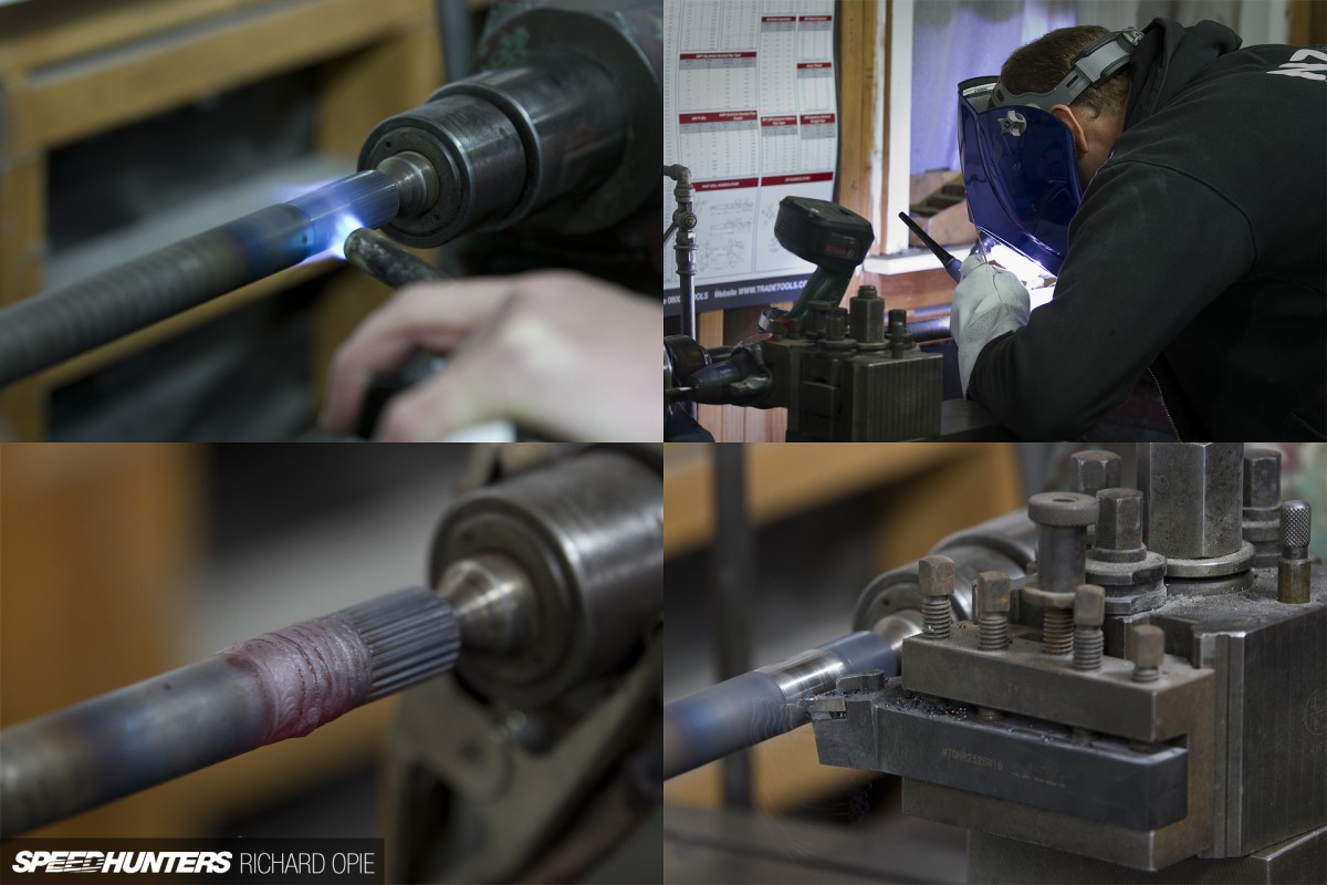 As well as a shortened housing, the axles themselves require some length to be cut out. Without going into too much detail, even though the spline on the ends looks to the naked eye like it matches the diameter of the shaft itself, the roll-forming process, by which it is factory formed, leaves a diameter slightly larger. Which means in order to be able to machine a new spline onto the shortened axle, building up of the material via a spiral welding process is required. Following the machining of the axle to correct diameter (bottom right), new splines were cut by a specialist.